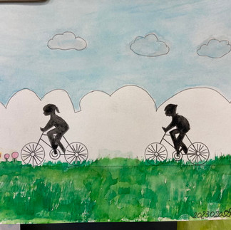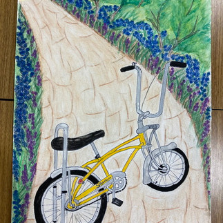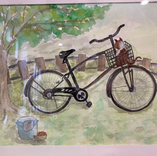 ある日のこと、アートサロンが主な活動拠点としている公民館に、近隣の方からお借りした3台の自転車が並びました。大きさも色も形も異なる自転車をモチーフに、好きなように背景を想像して描くというのが今回のテーマ。